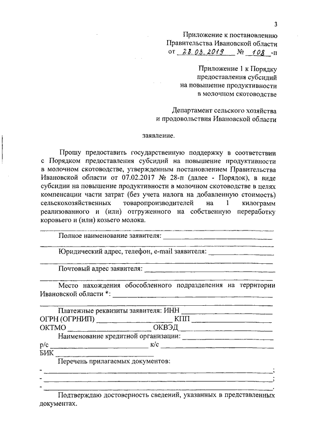 Постановление Правительства Ивановской области от 28.03.2019 N 108-п "О внесении изменений в постановление Правительства Ивановской области от 07.02.2017 N 28-п "Об утверждении Порядка предоставления субсидий на повышение продуктивности в молочном скотоводстве"