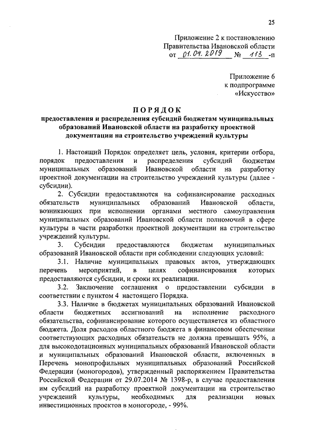 Постановление Правительства Ивановской области от 01.04.2019 N 113-п "О внесении изменений в постановление Правительства Ивановской области от 06.12.2017 N 455-п "Об утверждении государственной программы Ивановской области "Развитие культуры и туризма в Ивановской области" (вместе с "Порядком предоставления и распределения субсидий бюджетам муниципальных образований Ивановской области на укрепление материально-технической базы муниципальных учреждений культуры Ивановской области", "Порядком предоставления и распределения субсидий бюджетам муниципальных образований Ивановской области на разработку проектной документации на строительство учреждений культуры", "Порядком предоставления и распределения субсидий бюджетам муниципальных образований Ивановской области на создание (реконструкцию) и капитальный ремонт культурно-досуговых учреждений в сельской местности")