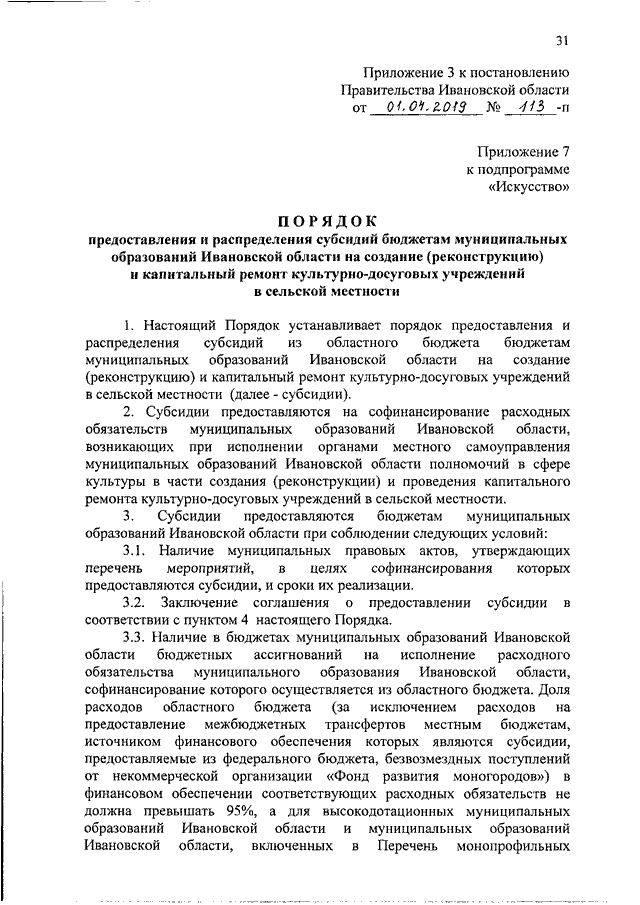Постановление Правительства Ивановской области от 01.04.2019 N 113-п "О внесении изменений в постановление Правительства Ивановской области от 06.12.2017 N 455-п "Об утверждении государственной программы Ивановской области "Развитие культуры и туризма в Ивановской области" (вместе с "Порядком предоставления и распределения субсидий бюджетам муниципальных образований Ивановской области на укрепление материально-технической базы муниципальных учреждений культуры Ивановской области", "Порядком предоставления и распределения субсидий бюджетам муниципальных образований Ивановской области на разработку проектной документации на строительство учреждений культуры", "Порядком предоставления и распределения субсидий бюджетам муниципальных образований Ивановской области на создание (реконструкцию) и капитальный ремонт культурно-досуговых учреждений в сельской местности")