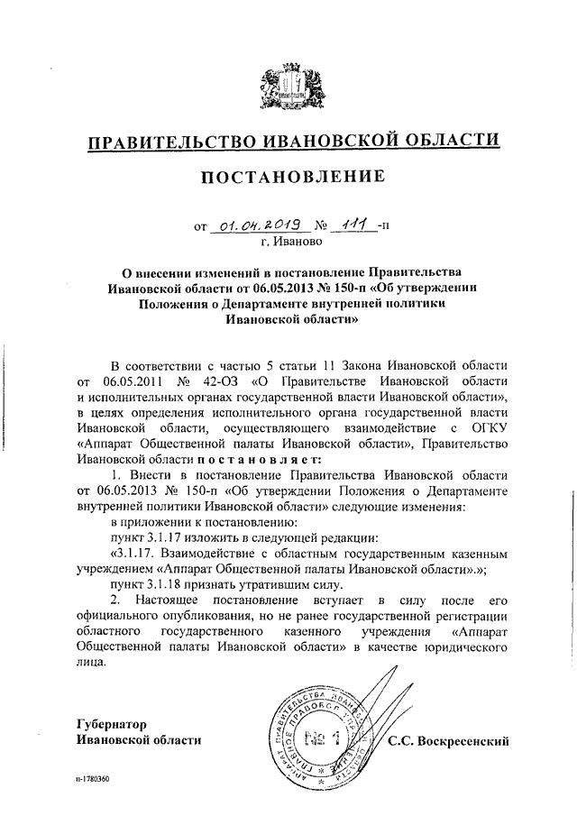 Постановление Правительства Ивановской области от 01.04.2019 N 111-п "О внесении изменений в постановление Правительства Ивановской области от 06.05.2013 N 150-п "Об утверждении Положения о Департаменте внутренней политики Ивановской области"