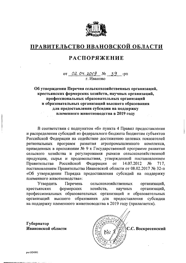 Распоряжение Правительства Ивановской области от 02.04.2019 N 39-рп "Об утверждении Перечня сельскохозяйственных организаций, крестьянских фермерских хозяйств, научных организаций, профессиональных образовательных организаций и образовательных организаций высшего образования для предоставления субсидии на поддержку племенного животноводства в 2019 году"