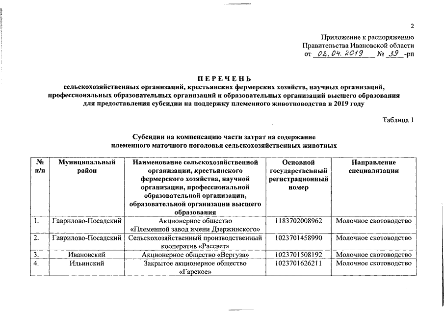 Распоряжение Правительства Ивановской области от 02.04.2019 N 39-рп "Об утверждении Перечня сельскохозяйственных организаций, крестьянских фермерских хозяйств, научных организаций, профессиональных образовательных организаций и образовательных организаций высшего образования для предоставления субсидии на поддержку племенного животноводства в 2019 году"
