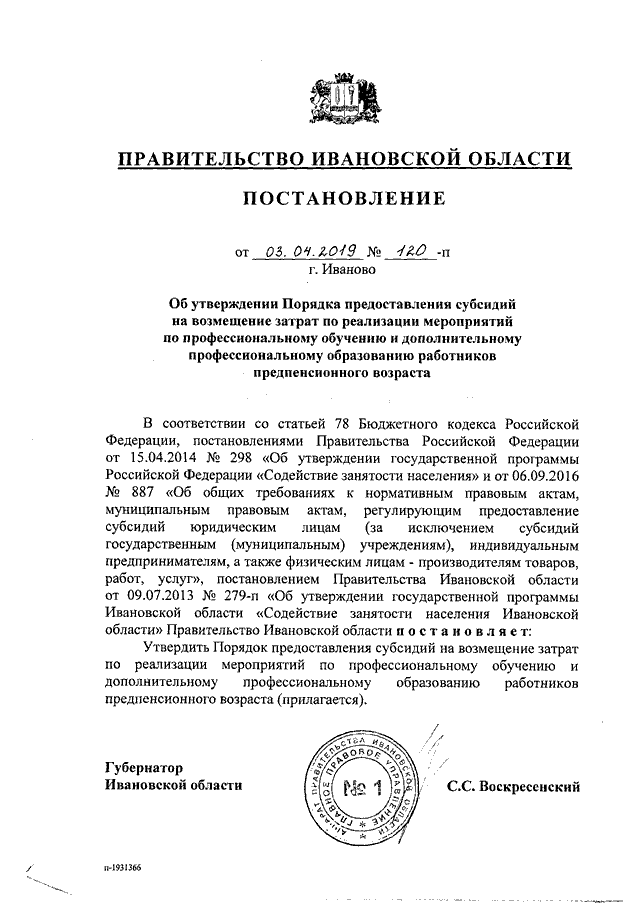 Постановление Правительства Ивановской области от 03.04.2019 N 120-п "Об утверждении Порядка предоставления субсидий на возмещение затрат по реализации мероприятий по профессиональному обучению и дополнительному профессиональному образованию работников предпенсионного возраста"