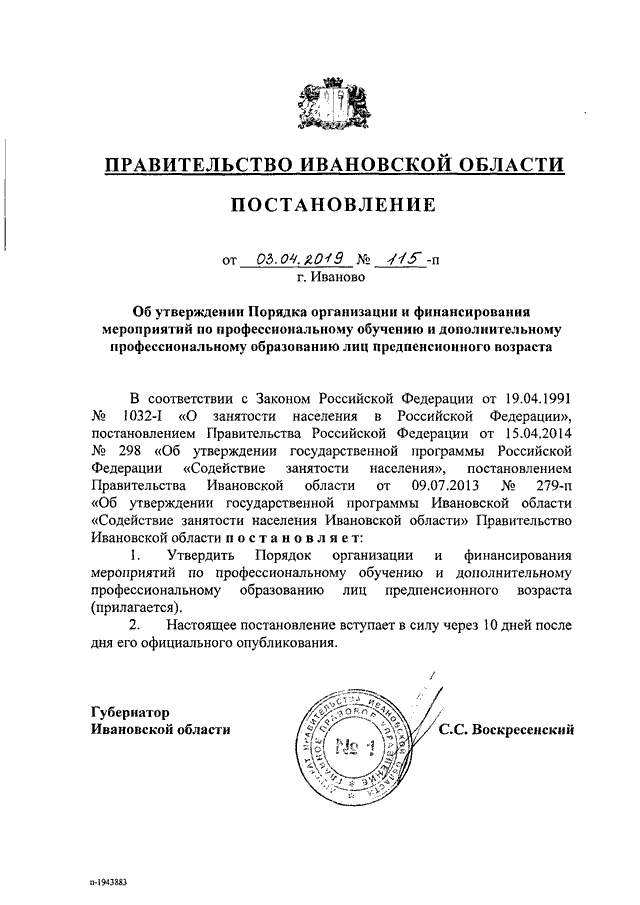 Постановление Правительства Ивановской области от 03.04.2019 N 115-п "Об утверждении Порядка организации и финансирования мероприятий по профессиональному обучению и дополнительному профессиональному образованию лиц предпенсионного возраста"