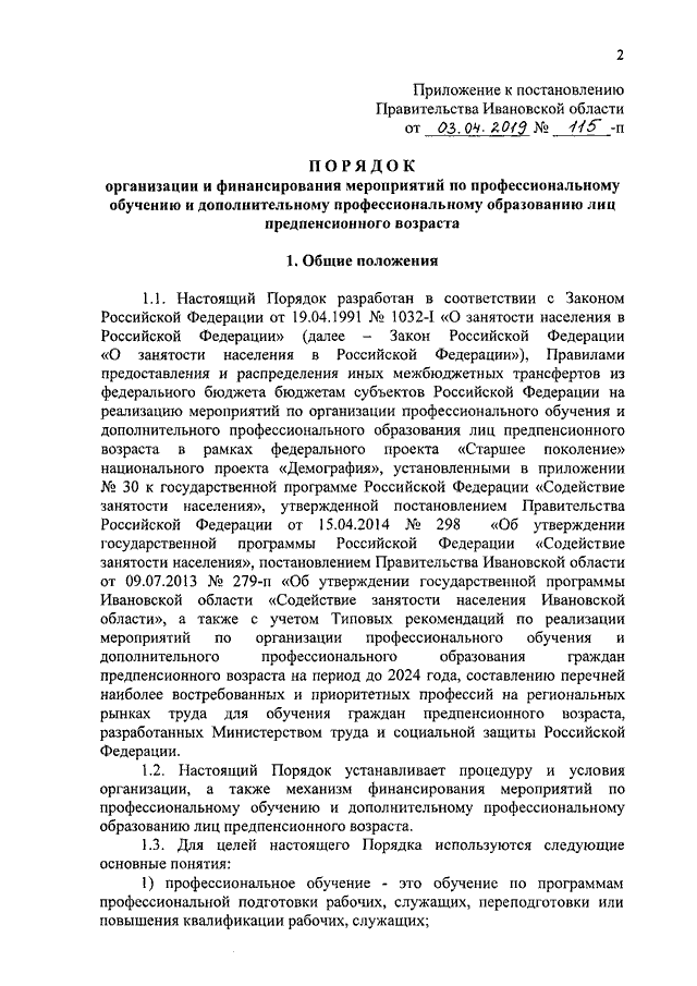 Постановление Правительства Ивановской области от 03.04.2019 N 115-п "Об утверждении Порядка организации и финансирования мероприятий по профессиональному обучению и дополнительному профессиональному образованию лиц предпенсионного возраста"
