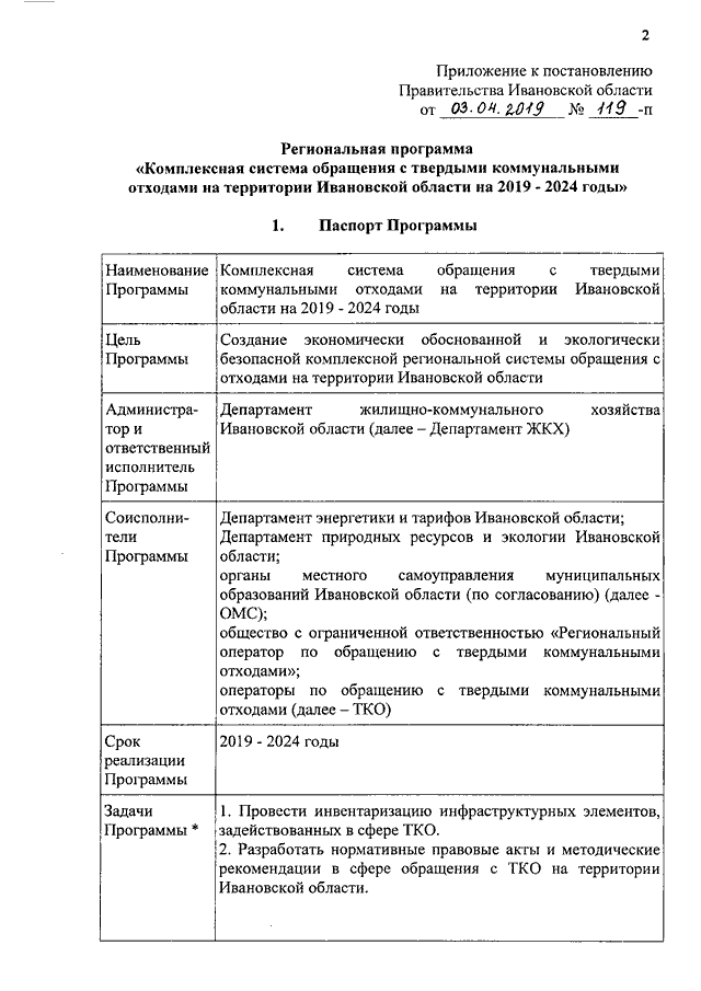 Постановление Правительства Ивановской области от 03.04.2019 N 119-п "Об утверждении региональной программы Ивановской области "Комплексная система обращения с твердыми коммунальными отходами на территории Ивановской области на 2019 - 2024 годы"
