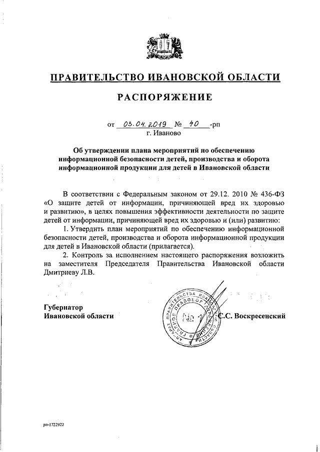 Распоряжение Правительства Ивановской области от 03.04.2019 N 40-рп "Об утверждении плана мероприятий по обеспечению информационной безопасности детей, производства и оборота информационной продукции для детей в Ивановской области"