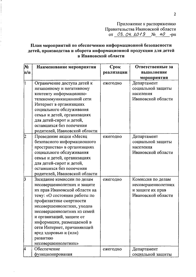 Распоряжение Правительства Ивановской области от 03.04.2019 N 40-рп "Об утверждении плана мероприятий по обеспечению информационной безопасности детей, производства и оборота информационной продукции для детей в Ивановской области"