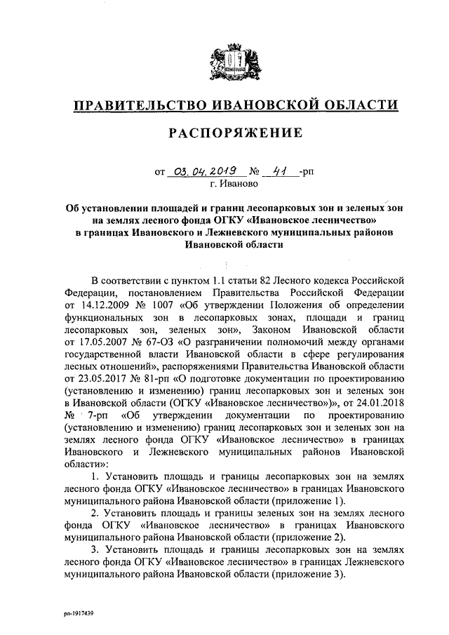 Распоряжение Правительства Ивановской области от 03.04.2019 N 41-рп "Об установлении площадей и границ лесопарковых зон и зеленых зон на землях лесного фонда ОГКУ "Ивановское лесничество" в границах Ивановского и Лежневского муниципальных районов Ивановской области"