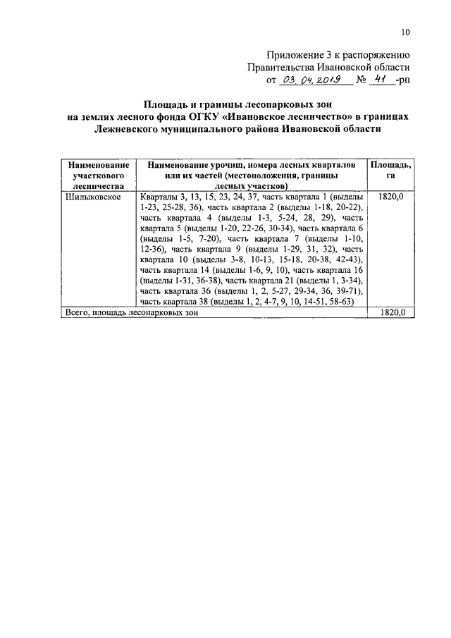 Распоряжение Правительства Ивановской области от 03.04.2019 N 41-рп "Об установлении площадей и границ лесопарковых зон и зеленых зон на землях лесного фонда ОГКУ "Ивановское лесничество" в границах Ивановского и Лежневского муниципальных районов Ивановской области"