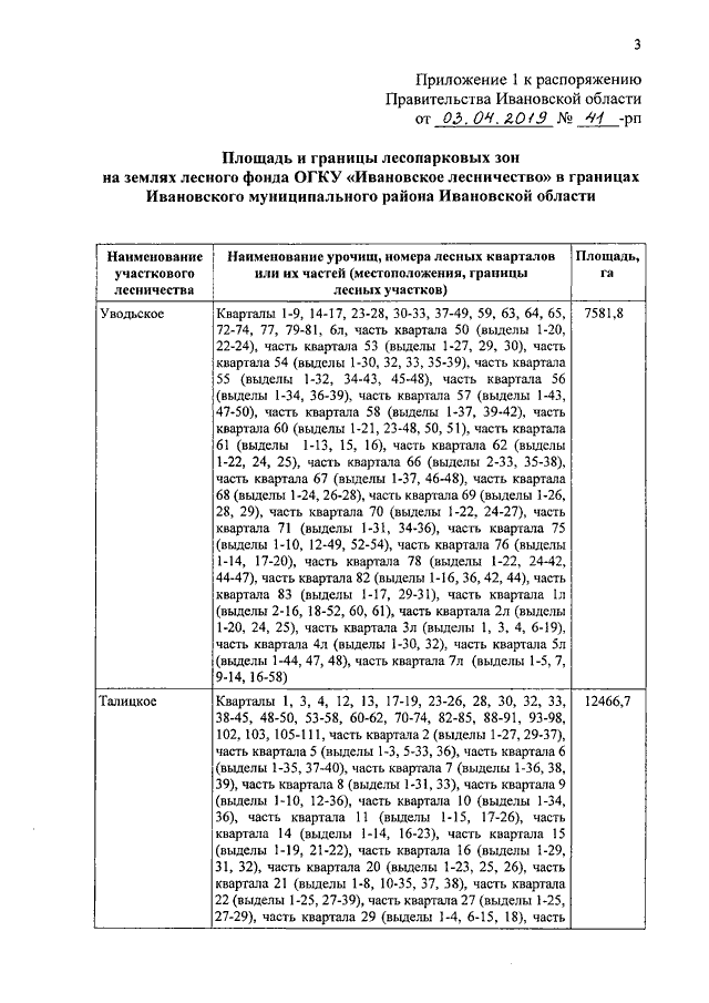 Распоряжение Правительства Ивановской области от 03.04.2019 N 41-рп "Об установлении площадей и границ лесопарковых зон и зеленых зон на землях лесного фонда ОГКУ "Ивановское лесничество" в границах Ивановского и Лежневского муниципальных районов Ивановской области"