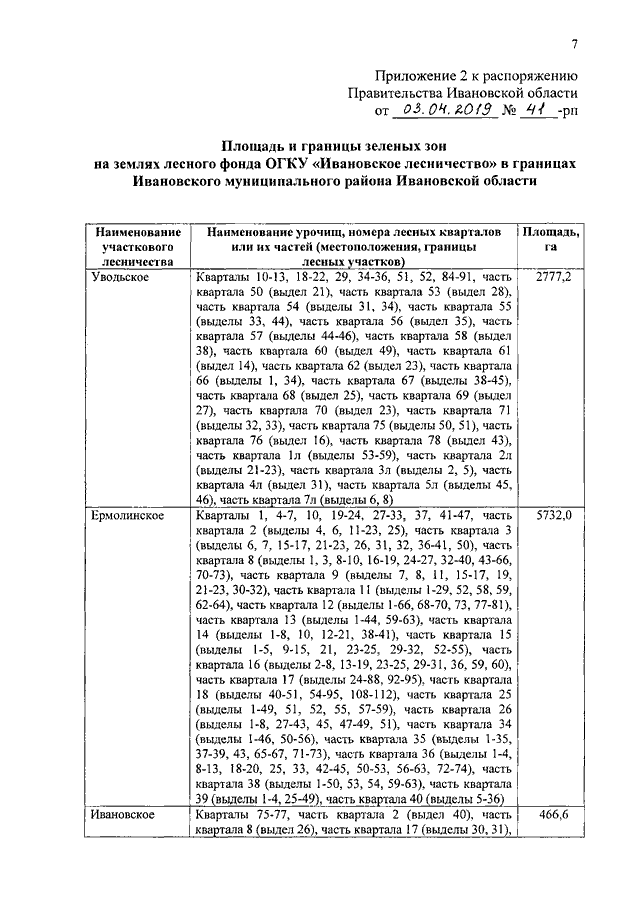 Распоряжение Правительства Ивановской области от 03.04.2019 N 41-рп "Об установлении площадей и границ лесопарковых зон и зеленых зон на землях лесного фонда ОГКУ "Ивановское лесничество" в границах Ивановского и Лежневского муниципальных районов Ивановской области"