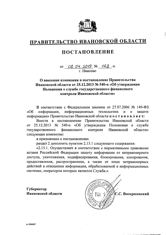 Постановление Правительства Ивановской области от 08.04.2019 N 128-п "О внесении изменения в постановление Правительства Ивановской области от 25.12.2013 N 540-п "Об утверждении Положения о службе государственного финансового контроля Ивановской области"