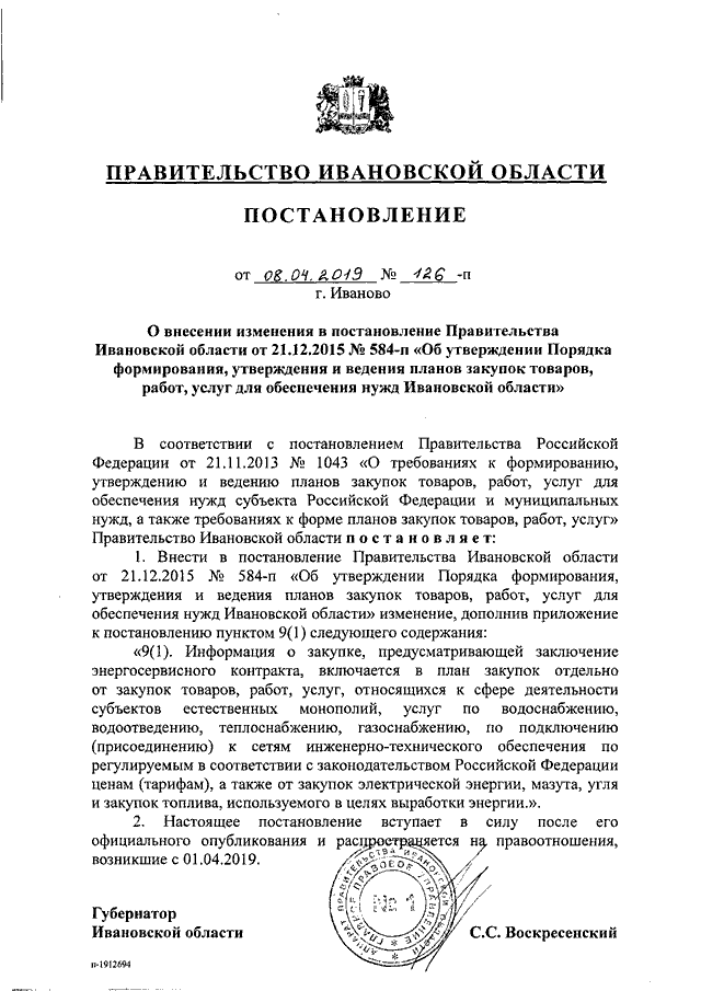 Постановление Правительства Ивановской области от 08.04.2019 N 126-п "О внесении изменения в постановление Правительства Ивановской области от 21.12.2015 N 584-п "Об утверждении Порядка формирования, утверждения и ведения планов закупок товаров, работ, услуг для обеспечения нужд Ивановской области"