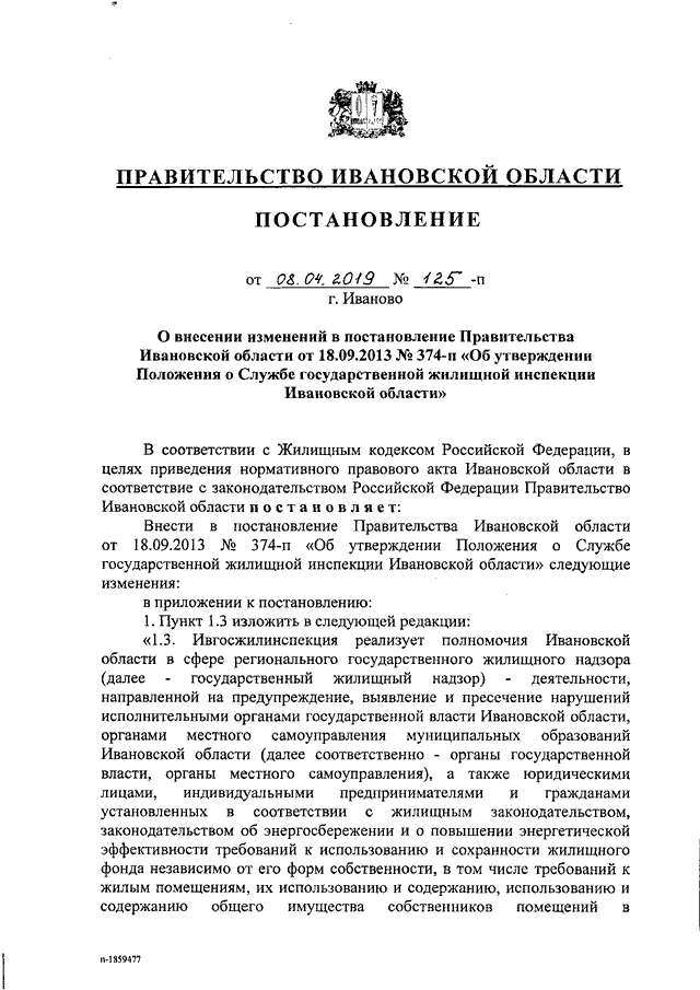 Постановление Правительства Ивановской области от 08.04.2019 N 125-п "О внесении изменений в постановление Правительства Ивановской области от 18.09.2013 N 374-п "Об утверждении Положения о Службе государственной жилищной инспекции Ивановской области"