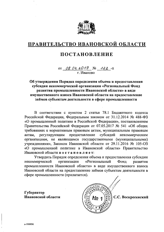 Постановление Правительства Ивановской области от 08.04.2019 N 122-п "Об утверждении Порядка определения объема и предоставления субсидии некоммерческой организации "Региональный Фонд развития промышленности Ивановской области" в виде имущественного взноса Ивановской области на предоставление займов субъектам деятельности в сфере промышленности"