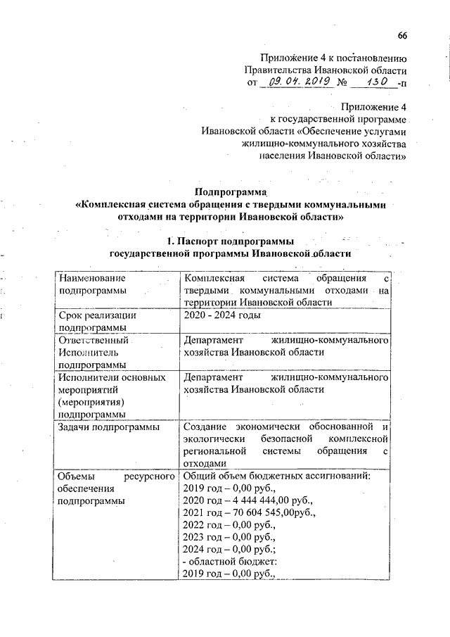 Постановление Правительства Ивановской области от 09.04.2019 N 130-п "О внесении изменений в постановление Правительства Ивановской области от 06.12.2017 N 458-п "Об утверждении государственной программы Ивановской области "Обеспечение услугами жилищно-коммунального хозяйства населения Ивановской области" (вместе с "Подпрограммой "Чистая вода Ивановской области", "Подпрограммой "Комплексная система обращения с твердыми коммунальными отходами на территории Ивановской области")
