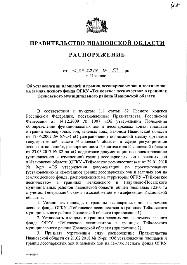 Распоряжение Правительства Ивановской области от 15.04.2019 N 52-рп "Об установлении площадей и границ лесопарковых зон и зеленых зон на землях лесного фонда ОГКУ "Тейковское лесничество" в границах Тейковского муниципального района Ивановской области"