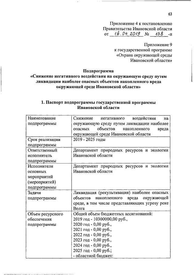 Постановление Правительства Ивановской области от 16.04.2019 N 138-п "О внесении изменений в постановление Правительства Ивановской области от 13.11.2013 N 452-п "Об утверждении государственной программы Ивановской области "Охрана окружающей среды Ивановской области" (вместе с "Порядком предоставления и распределения субсидий бюджетам муниципальных образований Ивановской области на разработку проектной и рабочей документации на строительство и (или) реконструкцию комплексов очистных сооружений и систем водоотведения", "Порядком предоставления и распределения субсидий бюджетам муниципальных образований Ивановской области на строительство и (или) реконструкцию комплексов очистных сооружений и систем водоотведения", "Порядком предоставления и распределения субсидий бюджетам муниципальных образований Ивановской области на сокращение доли загрязненных сточных вод", "Подпрограммой "Снижение негативного воздействия на окружающую среду путем ликвидации наиболее опасных объектов накопленного вреда окружающей среде Ивановской области")