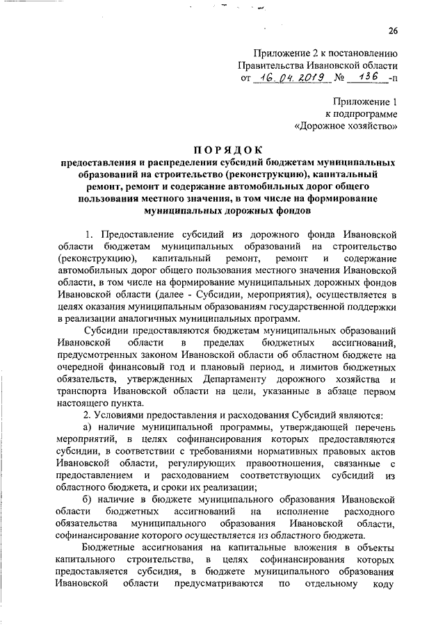 Постановление Правительства Ивановской области от 16.04.2019 N 136-п "О внесении изменений в постановление Правительства Ивановской области от 13.11.2013 N 447-п "Об утверждении государственной программы Ивановской области "Развитие транспортной системы Ивановской области" (вместе с "Порядком предоставления и распределения субсидий бюджетам муниципальных образований на строительство (реконструкцию), капитальный ремонт, ремонт и содержание автомобильных дорог общего пользования местного значения, в том числе на формирование муниципальных дорожных фондов", "Порядком предоставления и распределения субсидий бюджетам муниципальных образований на проектирование строительства (реконструкции) автомобильных дорог общего пользования местного значения с твердым покрытием до сельских населенных пунктов, не имеющих круглогодичной связи с сетью автомобильных дорог общего пользования", "Порядком предоставления и распределения субсидий бюджетам муниципальных образований на строительство, реконструкцию автомобильных дорог общего пользования местного значения с твердым покрытием до сельских населенных пунктов, не имеющих круглогодичной связи с сетью автомобильных дорог общего пользования, а также на их капитальный ремонт и ремонт")