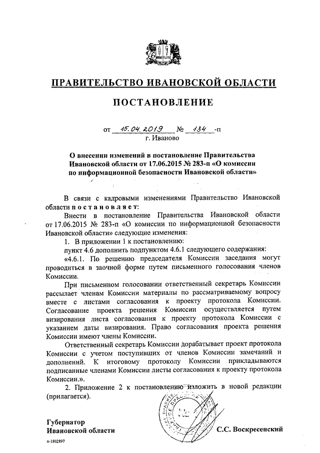 Постановление Правительства Ивановской области от 15.04.2019 N 134-п "О внесении изменений в постановление Правительства Ивановской области от 17.06.2015 N 283-п "О комиссии по информационной безопасности Ивановской области"