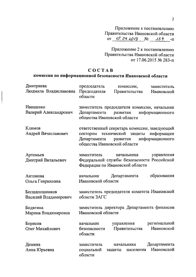Постановление Правительства Ивановской области от 15.04.2019 N 134-п "О внесении изменений в постановление Правительства Ивановской области от 17.06.2015 N 283-п "О комиссии по информационной безопасности Ивановской области"