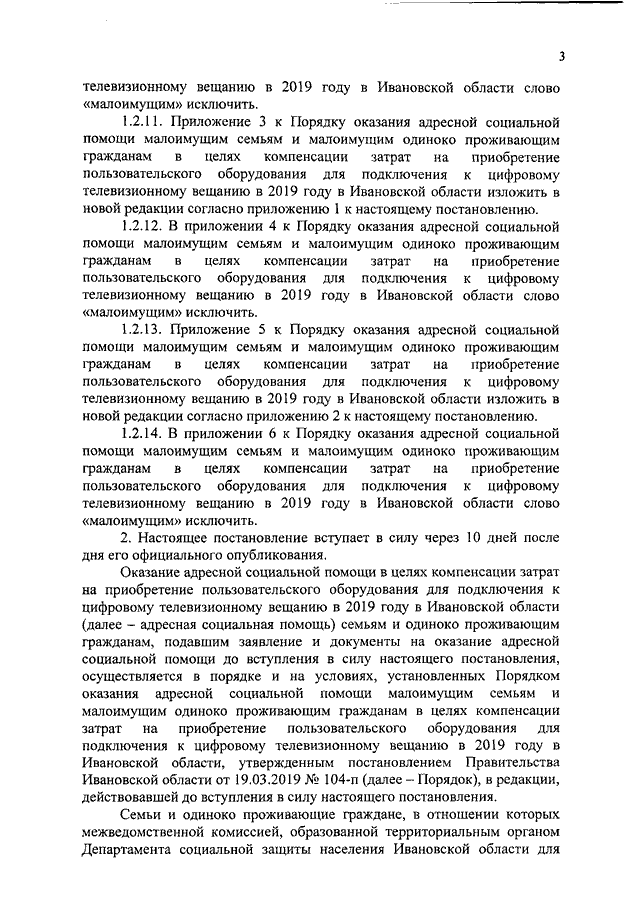 Постановление Правительства Ивановской области от 15.04.2019 N 133-п "О внесении изменений в постановление Правительства Ивановской области от 19.03.2019 N 104-п "Об утверждении Порядка оказания адресной социальной помощи малоимущим семьям и малоимущим одиноко проживающим гражданам в целях компенсации затрат на приобретение пользовательского оборудования для подключения к цифровому телевизионному вещанию в 2019 году в Ивановской области"