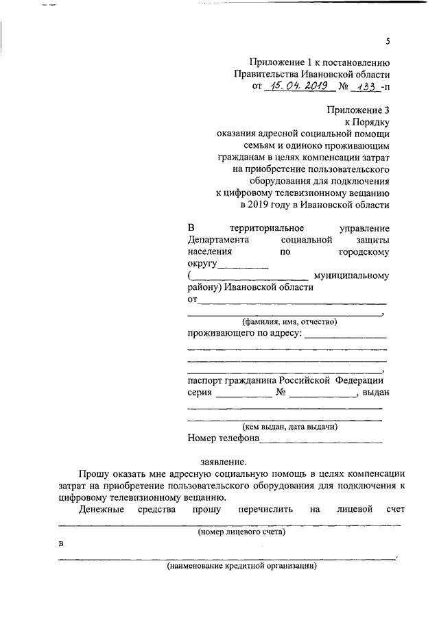 Постановление Правительства Ивановской области от 15.04.2019 N 133-п "О внесении изменений в постановление Правительства Ивановской области от 19.03.2019 N 104-п "Об утверждении Порядка оказания адресной социальной помощи малоимущим семьям и малоимущим одиноко проживающим гражданам в целях компенсации затрат на приобретение пользовательского оборудования для подключения к цифровому телевизионному вещанию в 2019 году в Ивановской области"