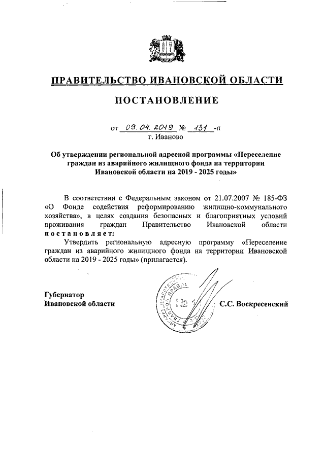 Постановление Правительства Ивановской области от 09.04.2019 N 131-п "Об утверждении региональной адресной программы "Переселение граждан из аварийного жилищного фонда на территории Ивановской области на 2019 - 2025 годы"