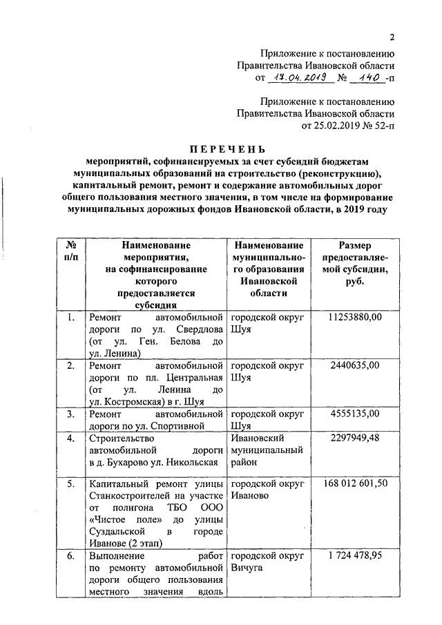 Постановление Правительства Ивановской области от 17.04.2019 N 140-п "О внесении изменения в постановление Правительства Ивановской области от 25.02.2019 N 52-п "Об утверждении перечня мероприятий, софинансируемых за счет субсидий бюджетам муниципальных образований на строительство (реконструкцию), капитальный ремонт, ремонт и содержание автомобильных дорог общего пользования местного значения, в том числе на формирование муниципальных дорожных фондов Ивановской области, в 2019 году"
