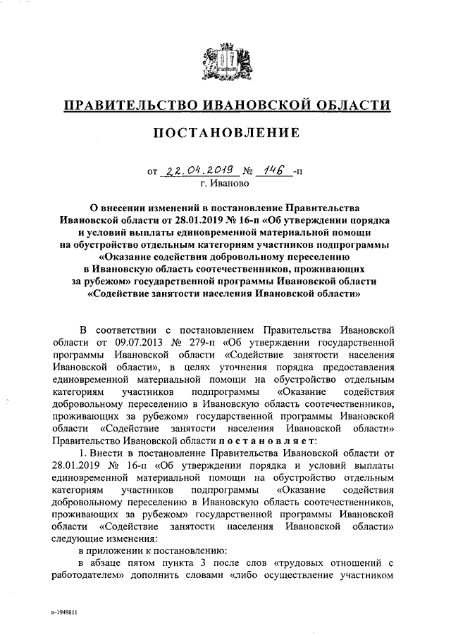Постановление Правительства Ивановской области от 22.04.2019 N 146-п "О внесении изменений в постановление Правительства Ивановской области от 28.01.2019 N 16-п "Об утверждении порядка и условий выплаты единовременной материальной помощи на обустройство отдельным категориям участников подпрограммы "Оказание содействия добровольному переселению в Ивановскую область соотечественников, проживающих за рубежом" государственной программы Ивановской области "Содействие занятости населения Ивановской области"