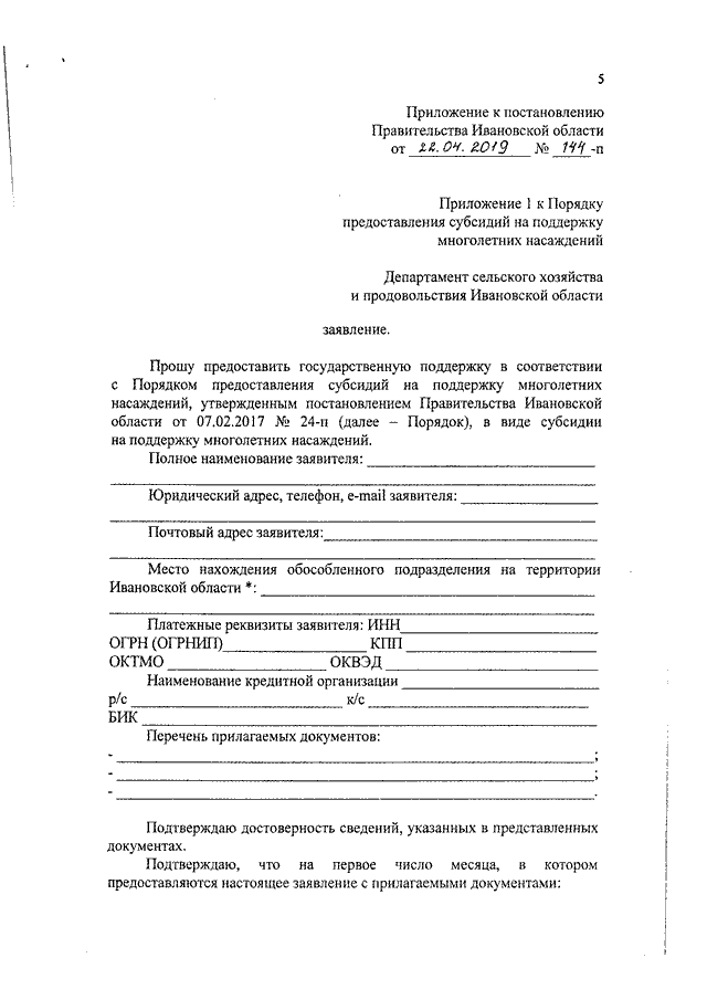 Постановление Правительства Ивановской области от 22.04.2019 N 144-п "О внесении изменений в постановление Правительства Ивановской области от 07.02.2017 N 24-п "Об утверждении Порядка предоставления субсидий на поддержку многолетних насаждений"