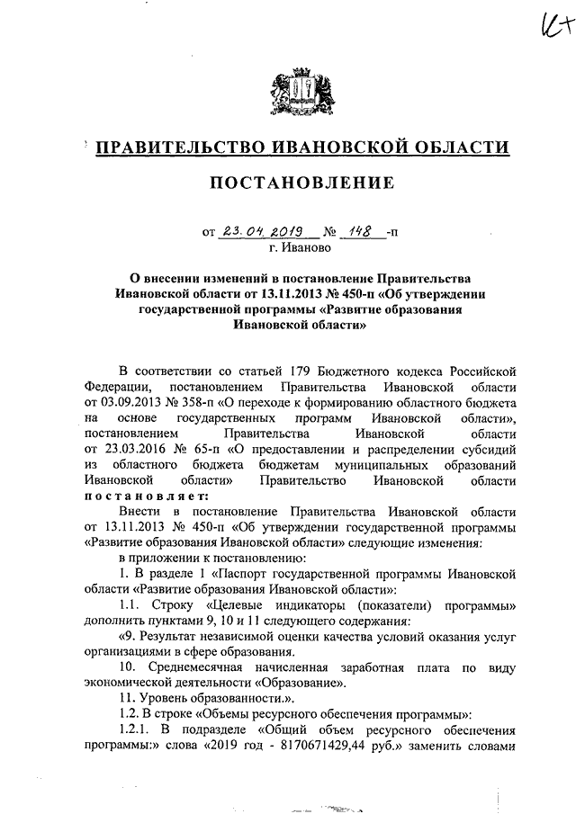 Постановление Правительства Ивановской области от 23.04.2019 N 148-п "О внесении изменений в постановление Правительства Ивановской области от 13.11.2013 N 450-п "Об утверждении государственной программы "Развитие образования Ивановской области" (вместе с "Порядком предоставления и распределения субсидий бюджетам муниципальных районов и городских округов Ивановской области на организацию целевой подготовки педагогов для работы в муниципальных образовательных организациях Ивановской области", "Порядком предоставления и распределения субсидий бюджетам муниципальных районов и городских округов Ивановской области на укрепление материально-технической базы муниципальных образовательных организаций Ивановской области", "Порядком предоставления и распределения субсидий бюджетам муниципальных образований Ивановской области на реализацию мероприятий по созданию дополнительных мест для детей в возрасте от 1,5 до 3 лет в образовательных организациях, осуществляющих образовательную деятельность по образовательным программам дошкольного образования", "Порядком предоставления и распределения субсидий бюджетам муниципальных образований Ивановской области на реализацию мероприятий по модернизации инфраструктуры общего образования", "Порядком предоставления и распределения бюджетам муниципальных районов, городских округов Ивановской области субсидий на софинансирование расходов, связанных с поэтапным доведением средней заработной платы педагогическим работникам иных муниципальных организаций дополнительного образования детей до средней заработной платы учителей в Ивановской области", "Порядком предоставления и распределения субсидий бюджетам муниципальных районов и городских округов Ивановской области на софинансирование расходов, связанных с поэтапным доведением средней заработной платы педагогическим работникам муниципальных организаций дополнительного образования детей в сфере физической культуры и спорта до средней заработной платы учителей в Ивановской области", "Порядком предоставления и распределения субсидий бюджетам муниципальных районов и городских округов Ивановской области на софинансирование расходов, связанных с поэтапным доведением средней заработной платы педагогическим работникам муниципальных организаций дополнительного образования детей в сфере культуры и искусства до средней заработной платы учителей в Ивановской области", "Порядком предоставления и распределения бюджетам муниципальных районов и городских округов Ивановской области субсидий на реализацию мероприятий по укреплению материально-технической базы и оснащение оборудованием детских школ искусств", "Порядком предоставления и распределения бюджетам муниципальных районов и городских округов Ивановской области субсидий на оснащение образовательных учреждений в сфере культуры музыкальными инструментами, оборудованием и учебными материалами", "Подпрограммой "Развитие цифровизации образовательного процесса в регионе")