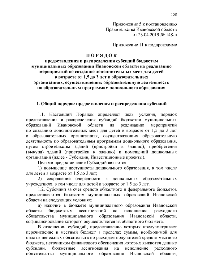 Постановление Правительства Ивановской области от 23.04.2019 N 148-п "О внесении изменений в постановление Правительства Ивановской области от 13.11.2013 N 450-п "Об утверждении государственной программы "Развитие образования Ивановской области" (вместе с "Порядком предоставления и распределения субсидий бюджетам муниципальных районов и городских округов Ивановской области на организацию целевой подготовки педагогов для работы в муниципальных образовательных организациях Ивановской области", "Порядком предоставления и распределения субсидий бюджетам муниципальных районов и городских округов Ивановской области на укрепление материально-технической базы муниципальных образовательных организаций Ивановской области", "Порядком предоставления и распределения субсидий бюджетам муниципальных образований Ивановской области на реализацию мероприятий по созданию дополнительных мест для детей в возрасте от 1,5 до 3 лет в образовательных организациях, осуществляющих образовательную деятельность по образовательным программам дошкольного образования", "Порядком предоставления и распределения субсидий бюджетам муниципальных образований Ивановской области на реализацию мероприятий по модернизации инфраструктуры общего образования", "Порядком предоставления и распределения бюджетам муниципальных районов, городских округов Ивановской области субсидий на софинансирование расходов, связанных с поэтапным доведением средней заработной платы педагогическим работникам иных муниципальных организаций дополнительного образования детей до средней заработной платы учителей в Ивановской области", "Порядком предоставления и распределения субсидий бюджетам муниципальных районов и городских округов Ивановской области на софинансирование расходов, связанных с поэтапным доведением средней заработной платы педагогическим работникам муниципальных организаций дополнительного образования детей в сфере физической культуры и спорта до средней заработной платы учителей в Ивановской области", "Порядком предоставления и распределения субсидий бюджетам муниципальных районов и городских округов Ивановской области на софинансирование расходов, связанных с поэтапным доведением средней заработной платы педагогическим работникам муниципальных организаций дополнительного образования детей в сфере культуры и искусства до средней заработной платы учителей в Ивановской области", "Порядком предоставления и распределения бюджетам муниципальных районов и городских округов Ивановской области субсидий на реализацию мероприятий по укреплению материально-технической базы и оснащение оборудованием детских школ искусств", "Порядком предоставления и распределения бюджетам муниципальных районов и городских округов Ивановской области субсидий на оснащение образовательных учреждений в сфере культуры музыкальными инструментами, оборудованием и учебными материалами", "Подпрограммой "Развитие цифровизации образовательного процесса в регионе")