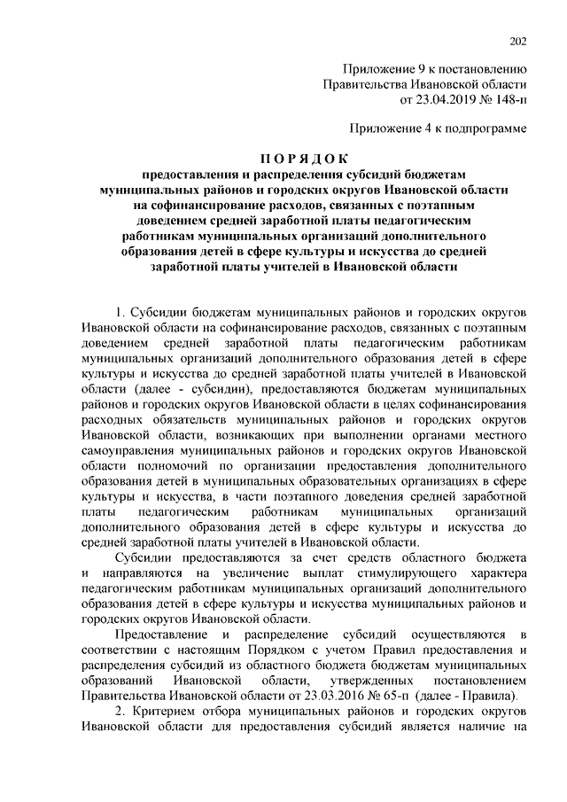 Постановление Правительства Ивановской области от 23.04.2019 N 148-п "О внесении изменений в постановление Правительства Ивановской области от 13.11.2013 N 450-п "Об утверждении государственной программы "Развитие образования Ивановской области" (вместе с "Порядком предоставления и распределения субсидий бюджетам муниципальных районов и городских округов Ивановской области на организацию целевой подготовки педагогов для работы в муниципальных образовательных организациях Ивановской области", "Порядком предоставления и распределения субсидий бюджетам муниципальных районов и городских округов Ивановской области на укрепление материально-технической базы муниципальных образовательных организаций Ивановской области", "Порядком предоставления и распределения субсидий бюджетам муниципальных образований Ивановской области на реализацию мероприятий по созданию дополнительных мест для детей в возрасте от 1,5 до 3 лет в образовательных организациях, осуществляющих образовательную деятельность по образовательным программам дошкольного образования", "Порядком предоставления и распределения субсидий бюджетам муниципальных образований Ивановской области на реализацию мероприятий по модернизации инфраструктуры общего образования", "Порядком предоставления и распределения бюджетам муниципальных районов, городских округов Ивановской области субсидий на софинансирование расходов, связанных с поэтапным доведением средней заработной платы педагогическим работникам иных муниципальных организаций дополнительного образования детей до средней заработной платы учителей в Ивановской области", "Порядком предоставления и распределения субсидий бюджетам муниципальных районов и городских округов Ивановской области на софинансирование расходов, связанных с поэтапным доведением средней заработной платы педагогическим работникам муниципальных организаций дополнительного образования детей в сфере физической культуры и спорта до средней заработной платы учителей в Ивановской области", "Порядком предоставления и распределения субсидий бюджетам муниципальных районов и городских округов Ивановской области на софинансирование расходов, связанных с поэтапным доведением средней заработной платы педагогическим работникам муниципальных организаций дополнительного образования детей в сфере культуры и искусства до средней заработной платы учителей в Ивановской области", "Порядком предоставления и распределения бюджетам муниципальных районов и городских округов Ивановской области субсидий на реализацию мероприятий по укреплению материально-технической базы и оснащение оборудованием детских школ искусств", "Порядком предоставления и распределения бюджетам муниципальных районов и городских округов Ивановской области субсидий на оснащение образовательных учреждений в сфере культуры музыкальными инструментами, оборудованием и учебными материалами", "Подпрограммой "Развитие цифровизации образовательного процесса в регионе")