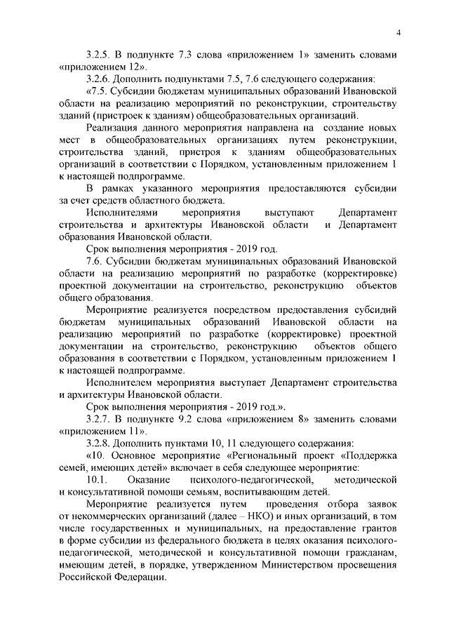 Постановление Правительства Ивановской области от 23.04.2019 N 148-п "О внесении изменений в постановление Правительства Ивановской области от 13.11.2013 N 450-п "Об утверждении государственной программы "Развитие образования Ивановской области" (вместе с "Порядком предоставления и распределения субсидий бюджетам муниципальных районов и городских округов Ивановской области на организацию целевой подготовки педагогов для работы в муниципальных образовательных организациях Ивановской области", "Порядком предоставления и распределения субсидий бюджетам муниципальных районов и городских округов Ивановской области на укрепление материально-технической базы муниципальных образовательных организаций Ивановской области", "Порядком предоставления и распределения субсидий бюджетам муниципальных образований Ивановской области на реализацию мероприятий по созданию дополнительных мест для детей в возрасте от 1,5 до 3 лет в образовательных организациях, осуществляющих образовательную деятельность по образовательным программам дошкольного образования", "Порядком предоставления и распределения субсидий бюджетам муниципальных образований Ивановской области на реализацию мероприятий по модернизации инфраструктуры общего образования", "Порядком предоставления и распределения бюджетам муниципальных районов, городских округов Ивановской области субсидий на софинансирование расходов, связанных с поэтапным доведением средней заработной платы педагогическим работникам иных муниципальных организаций дополнительного образования детей до средней заработной платы учителей в Ивановской области", "Порядком предоставления и распределения субсидий бюджетам муниципальных районов и городских округов Ивановской области на софинансирование расходов, связанных с поэтапным доведением средней заработной платы педагогическим работникам муниципальных организаций дополнительного образования детей в сфере физической культуры и спорта до средней заработной платы учителей в Ивановской области", "Порядком предоставления и распределения субсидий бюджетам муниципальных районов и городских округов Ивановской области на софинансирование расходов, связанных с поэтапным доведением средней заработной платы педагогическим работникам муниципальных организаций дополнительного образования детей в сфере культуры и искусства до средней заработной платы учителей в Ивановской области", "Порядком предоставления и распределения бюджетам муниципальных районов и городских округов Ивановской области субсидий на реализацию мероприятий по укреплению материально-технической базы и оснащение оборудованием детских школ искусств", "Порядком предоставления и распределения бюджетам муниципальных районов и городских округов Ивановской области субсидий на оснащение образовательных учреждений в сфере культуры музыкальными инструментами, оборудованием и учебными материалами", "Подпрограммой "Развитие цифровизации образовательного процесса в регионе")