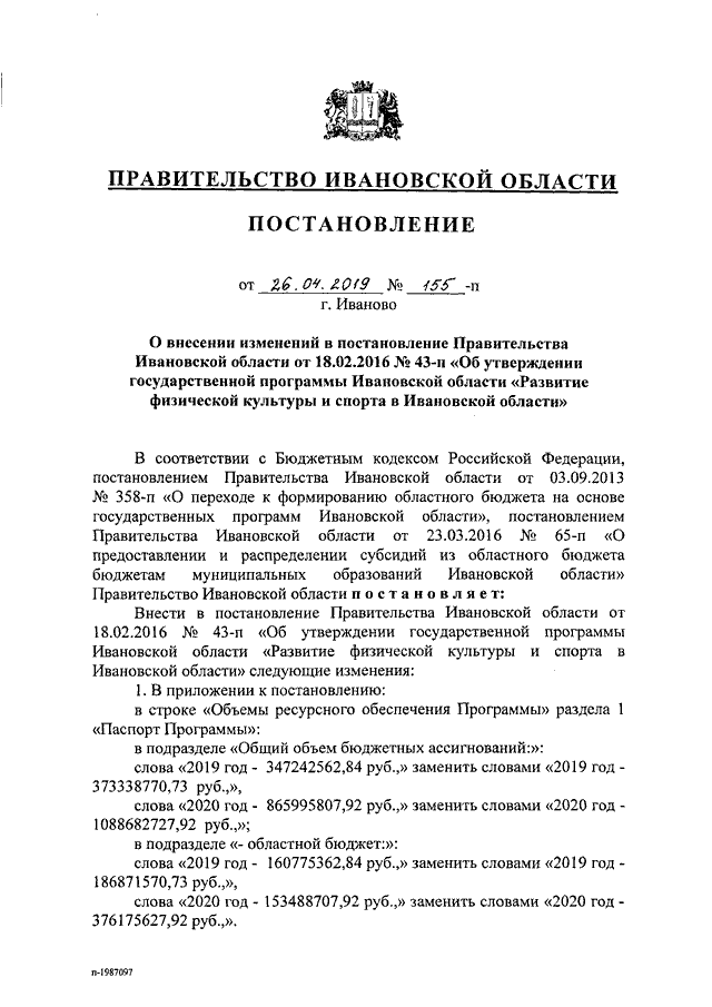 Постановление Правительства Ивановской области от 26.04.2019 N 155-п "О внесении изменений в постановление Правительства Ивановской области от 18.02.2016 N 43-п "Об утверждении государственной программы Ивановской области "Развитие физической культуры и спорта в Ивановской области"