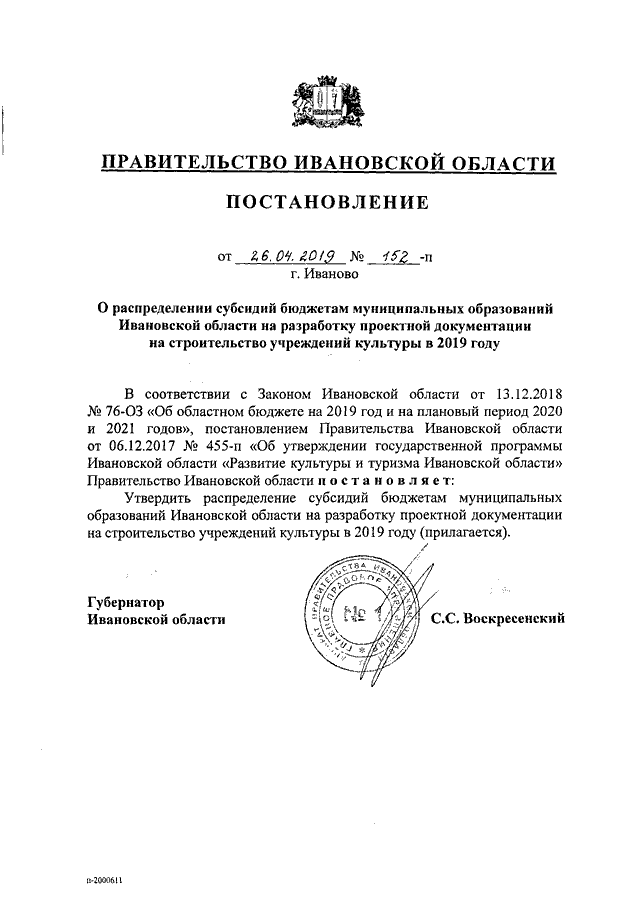 Постановление Правительства Ивановской области от 26.04.2019 N 152-п "О распределении субсидий бюджетам муниципальных образований Ивановской области на разработку проектной документации на строительство учреждений культуры в 2019 году"