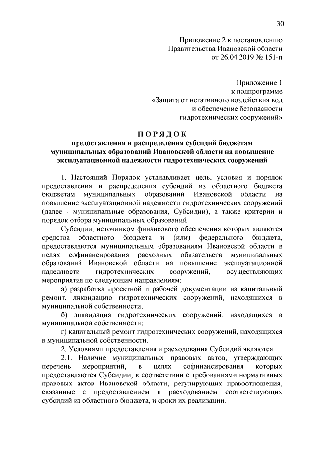 Постановление Правительства Ивановской области от 26.04.2019 N 151-п "О внесении изменений в постановление Правительства Ивановской области от 30.10.2013 N 430-п "Об утверждении государственной программы Ивановской области "Развитие водохозяйственного комплекса Ивановской области" (вместе с "Порядком предоставления и распределения субсидий бюджетам муниципальных образований Ивановской области на восстановление и экологическую реабилитацию водных объектов, утративших способность к самоочищению, предотвращение истощения водных объектов, ликвидацию их засорения и загрязнения", "Порядком предоставления и распределения субсидий бюджетам муниципальных образований Ивановской области на повышение эксплуатационной надежности гидротехнических сооружений", "Порядком предоставления и распределения субсидий бюджетам муниципальных образований Ивановской области на обеспечение населения и объектов экономики сооружениями инженерной защиты")