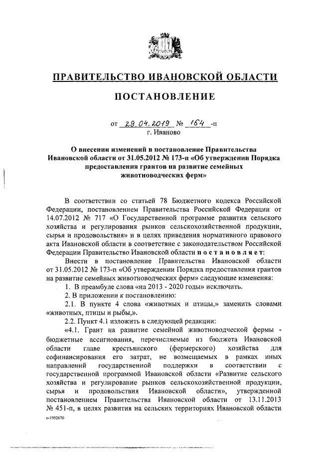 Постановление Правительства Ивановской области от 29.04.2019 N 164-п "О внесении изменений в постановление Правительства Ивановской области от 31.05.2012 N 173-п "Об утверждении Порядка предоставления грантов на развитие семейных животноводческих ферм"