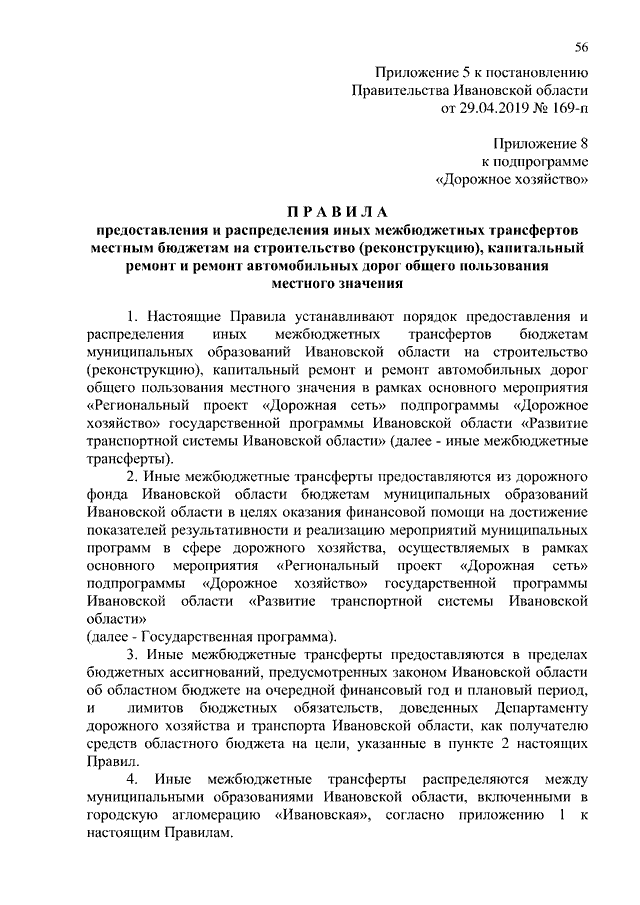 Постановление Правительства Ивановской области от 29.04.2019 N 169-п "О внесении изменений в постановление Правительства Ивановской области от 13.11.2013 N 447-п "Об утверждении государственной программы Ивановской области "Развитие транспортной системы Ивановской области" (вместе с "Правилами предоставления и распределения иных межбюджетных трансфертов местным бюджетам на строительство (реконструкцию), капитальный ремонт и ремонт автомобильных дорог общего пользования местного значения")