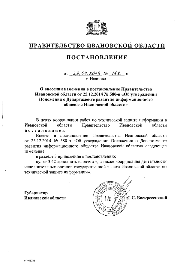Постановление Правительства Ивановской области от 29.04.2019 N 162-п "О внесении изменения в постановление Правительства Ивановской области от 25.12.2014 N 580-п "Об утверждении Положения о Департаменте развития информационного общества Ивановской области"