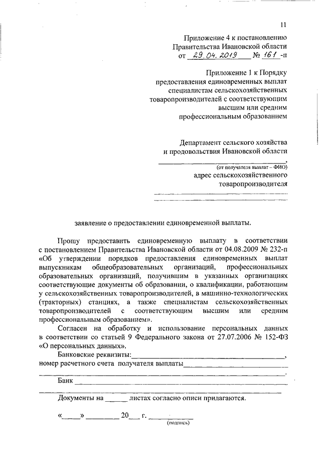 Постановление Правительства Ивановской области от 29.04.2019 N 161-п "О внесении изменений в постановление Правительства Ивановской области от 04.08.2009 N 232-п "Об утверждении порядков предоставления единовременных выплат выпускникам общеобразовательных организаций, профессиональных образовательных организаций, получившим в указанных организациях соответствующие документы об образовании, о квалификации, работающим у сельскохозяйственных товаропроизводителей, в машинно-технологических (тракторных) станциях, а также специалистам сельскохозяйственных товаропроизводителей с соответствующим высшим или средним профессиональным образованием"