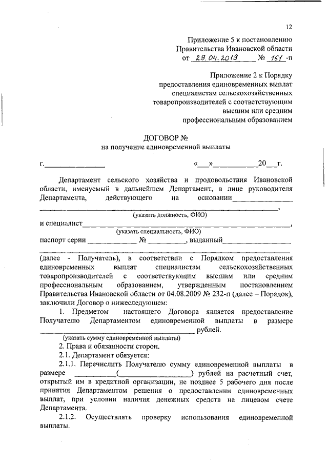 Постановление Правительства Ивановской области от 29.04.2019 N 161-п "О внесении изменений в постановление Правительства Ивановской области от 04.08.2009 N 232-п "Об утверждении порядков предоставления единовременных выплат выпускникам общеобразовательных организаций, профессиональных образовательных организаций, получившим в указанных организациях соответствующие документы об образовании, о квалификации, работающим у сельскохозяйственных товаропроизводителей, в машинно-технологических (тракторных) станциях, а также специалистам сельскохозяйственных товаропроизводителей с соответствующим высшим или средним профессиональным образованием"