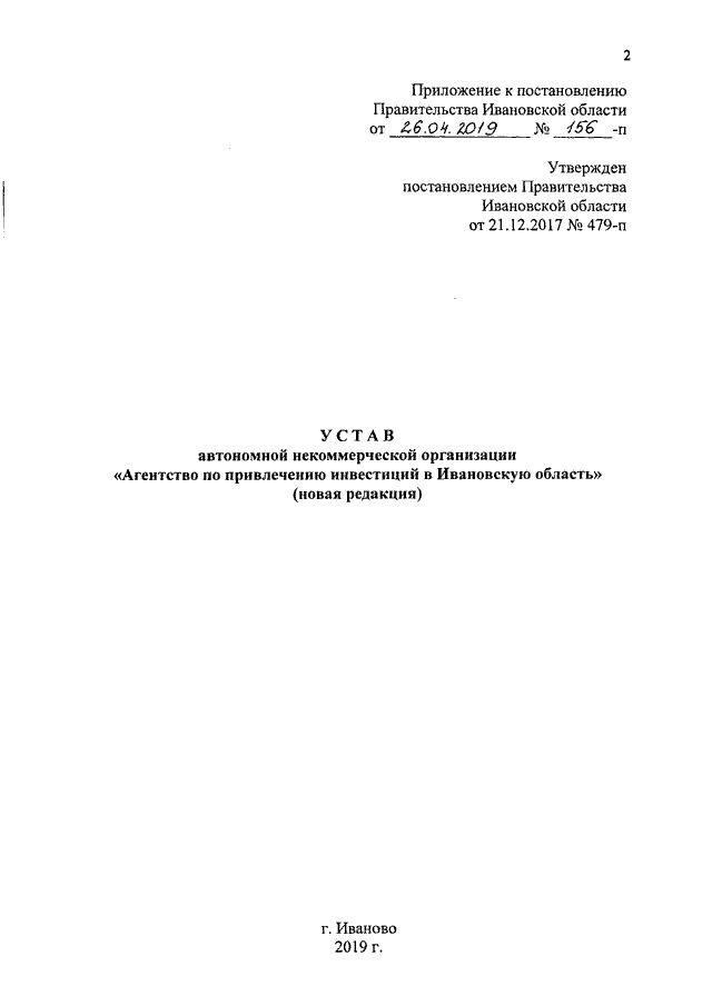 Постановление Правительства Ивановской области от 26.04.2019 N 156-п "О внесении изменений в постановление Правительства Ивановской области от 21.12.2017 N 479-п "О создании автономной некоммерческой организации "Агентство по привлечению инвестиций в Ивановскую область"