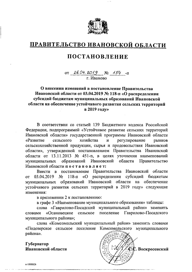 Постановление Правительства Ивановской области от 26.04.2019 N 154-п "О внесении изменений в постановление Правительства Ивановской области от 03.04.2019 N 118-п "О распределении субсидий бюджетам муниципальных образований Ивановской области на обеспечение устойчивого развития сельских территорий в 2019 году"