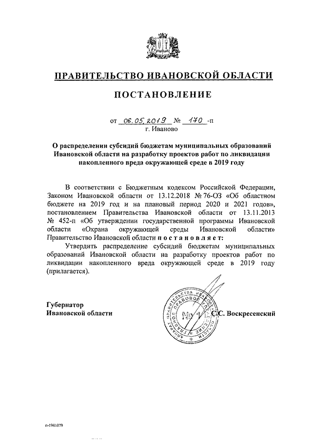 Постановление Правительства Ивановской области от 06.05.2019 N 170-п "О распределении субсидий бюджетам муниципальных образований Ивановской области на разработку проектов работ по ликвидации накопленного вреда окружающей среде в 2019 году"