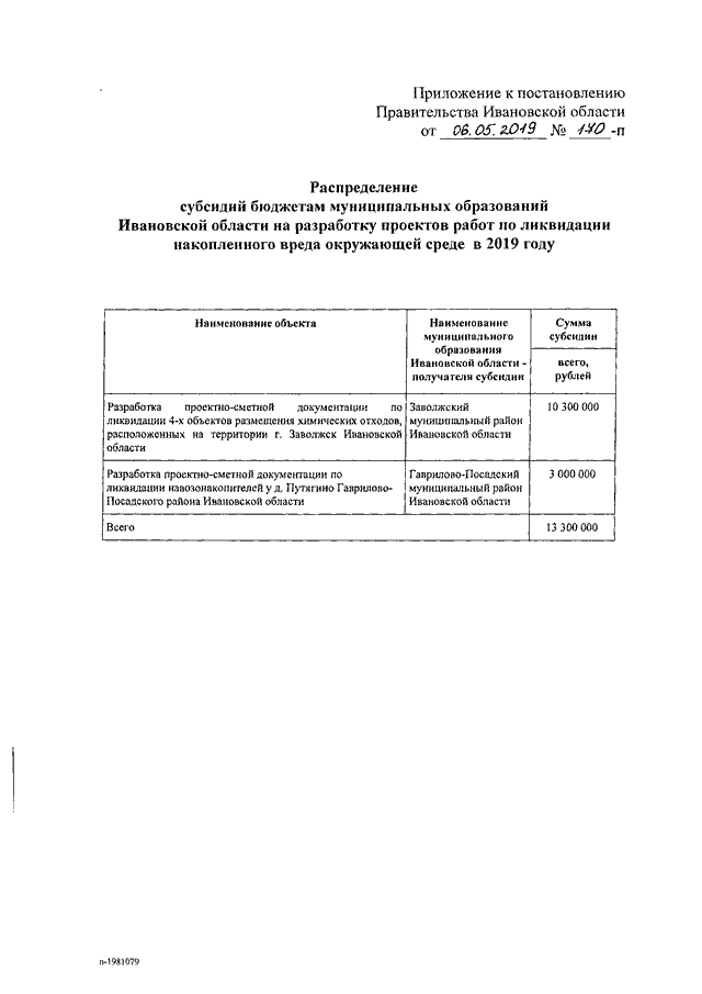 Постановление Правительства Ивановской области от 06.05.2019 N 170-п "О распределении субсидий бюджетам муниципальных образований Ивановской области на разработку проектов работ по ликвидации накопленного вреда окружающей среде в 2019 году"