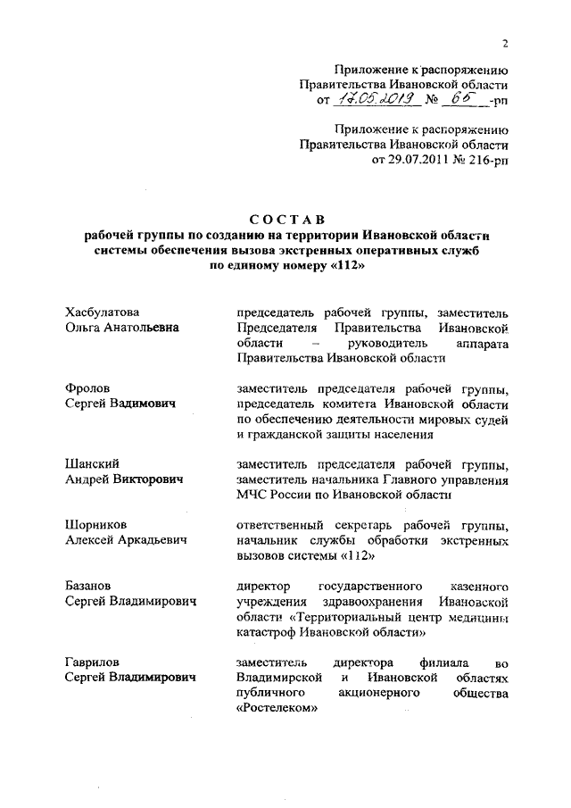 Распоряжение Правительства Ивановской области от 17.05.2019 N 65-рп "О внесении изменений в распоряжение Правительства Ивановской области от 29.07.2011 N 216-рп "Об организации и выполнении мероприятий по созданию на территории Ивановской области, развитию и организации эксплуатации системы обеспечения вызова экстренных оперативных служб по единому номеру "112"