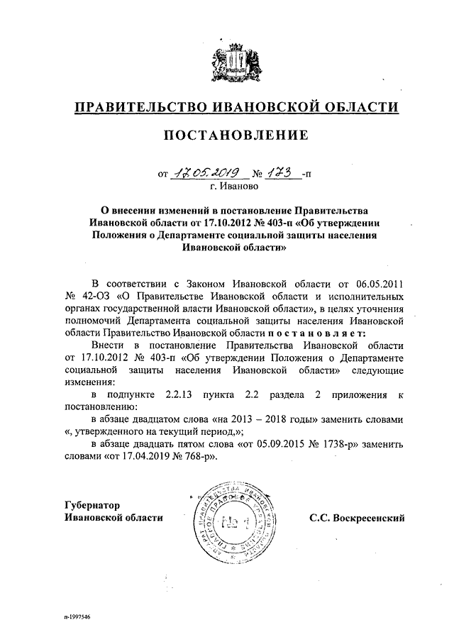 Постановление Правительства Ивановской области от 17.05.2019 N 173-п "О внесении изменений в постановление Правительства Ивановской области от 17.10.2012 N 403-п "Об утверждении Положения о Департаменте социальной защиты населения Ивановской области"